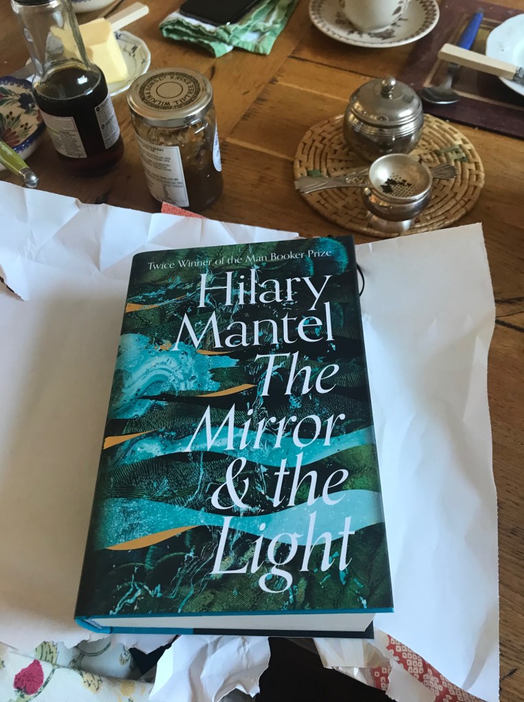 Here in London we both have small libraries crammed full of books that we cherish. We are both re-readers, I returning to history while he explores science. Though I’m a one-at-a-time gal there are at least seven books piled behind “The Mirror and the Light”.