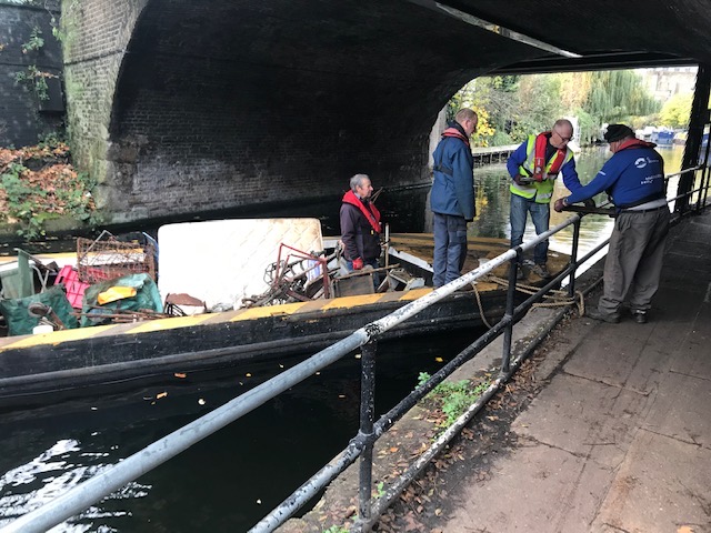 Walking alongside this stretch of Regent’s canal last week we caught up with a slow moving barge. Four men, volunteers from the auspices of Camden Counsel were chugging slowly along and coming to frequent stops under the bridges that cross over the canal. Beside each was a pile of old iron.