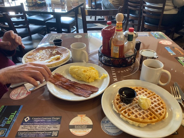 When you want a ‘good old American Breakfast’ you need a ‘good old American restaurant’ to go to. There are a couple still thriving on the main street of Novato, in California. We go to Marvin’s. The tables are crammed together, the outside dining that came in with Covid, remains – and for those new to Novato, with small fluffy dogs as accessories, those tables are fine. But for us, not locals but oldies, inside is better. The coffee comes quicker, the menu is there and you only get water if you ask for it. The restaurant is crammed and with a fluidity of a well-honed team the kitchen, and wait-staff dance between us all and even have time to smile and say hello. The clientele inside is mostly old, local, male and large. Which makes placing cardboard on the  floor of the tiny bathroom a more than sensible idea. So do the signs posted on the walls, ‘ For goodness sake clean up after yourself’, ‘Anything is possible if you have the courage to make it happen,’ ‘You never know what you have until it’s gone. Toilet paper for instance.’  Returning to our table, my second cup of coffee is ready for me and I am beginning to feel better. And that is the gift that a restaurant, worthy of the name, gives to its patrons.